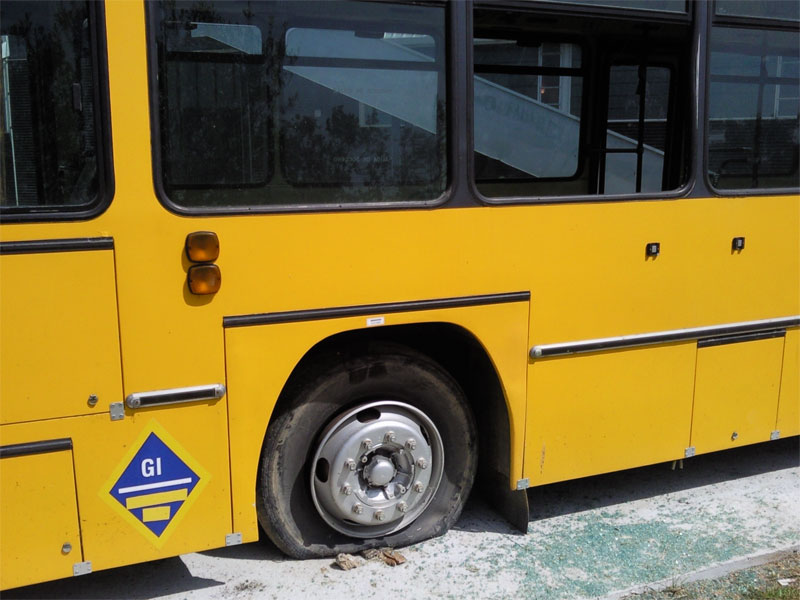 El del barri de St. Lluís té diferents vidres trencats i li han punxat alguna roda a banda de l’escampall de papers i altres materials propis del vehicle que es troben escampats pel voltant del bus.