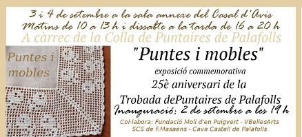 La Colla de Puntaires de Palafolls està de celebració i és que aquest any la seva trobada anual arriba als 25 anys. Per celebrar-ho han organitzat una exposició anomenada “Puntes i mobles” on es podran veure les possibilitats que ofereixen les puntes. A més, l’exposició s’ha fet en col·laboració amb la Fundació Molí d’en Puigvert, que ha cedit diferents mobles i accessoris que ells mateixos restauren, pel que també es podrà veure el seu treball.