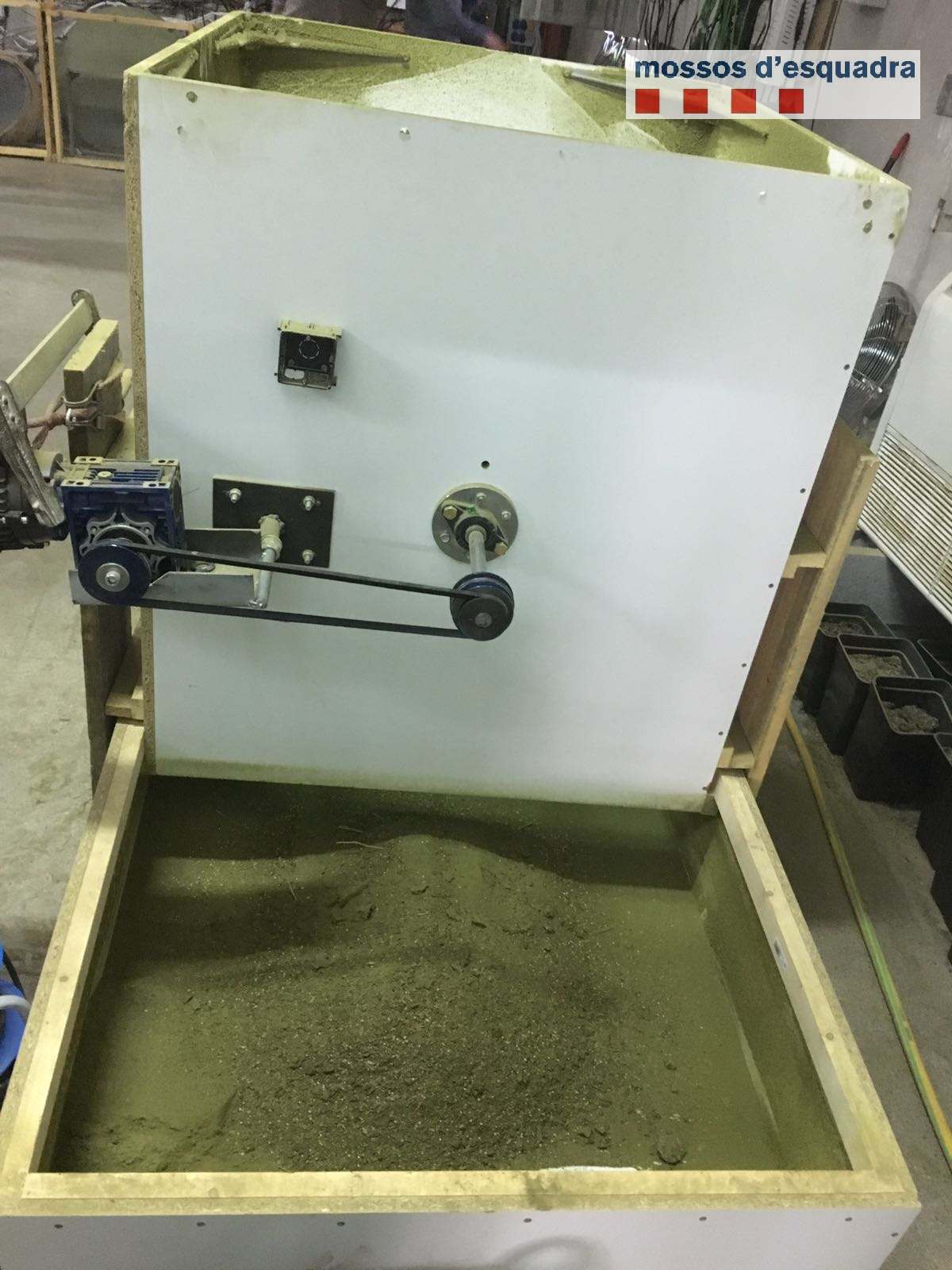 Els agents van observar que el local tenia dos pisos i que en cadascú hi havia plantes de marihuana en diferents estadis de creixement a banda també de diversos estris necessaris pel cultiu: una màquina centrifugadora que serveix per convertir la marihuana en pol·len d’haixix i una premsa i bosses per empaquetar el material per la seva venda final.