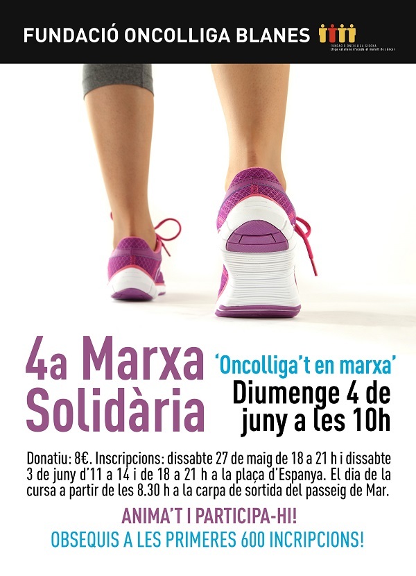 Respecte Blanes, es tracta de la 4ª marxa solidària “Oncolliga’t en marxa” que es farà també demà amb tret de sortida a les 10 a la carpa de sortida del passeig de Mar. Hi ha obsequi per les 600 primeres inscripcions. La inscripció també té un cost de 8 euros. Des de l’associació ja es parla de consolidació. Són declaració de l’Imma Billatriu és la presidenta d’Oncolliga Blanes.