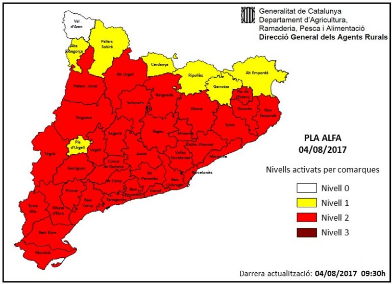 Avui la xifra de comarques en nivell 2 de risc d’incendi ascendeix fins a 34, segons el Pla Alfa, entre elles el Maresme.