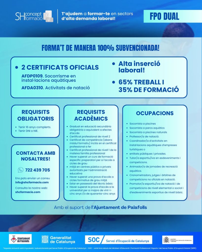 L’Ajuntament, en col·laboració amb el centre SH Concept Formació, impulsa una nova edició del programa de Formació Professional per a l’Ocupació Dual, en les especialitats de socorrisme aquàtic i tècnic o tècnica en activitats de natació.