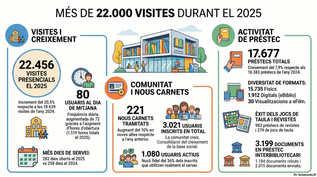 Segons recull la memòria anual de la Biblioteca Enric Miralles de Palafolls, l’equipament ha tancat l’any 2025 amb molt bones xifres. Concretament, s’ha assolit un total de 22.456 visites presencials, dada que representa un increment del 20,5% respecte a les 18.639 visites registrades l’any anterior. Aquest augment es tradueix en una mitjana de 80 usuaris diaris, gràcies també a l’ampliació dels dies de servei i de les hores d’obertura, que han passat de 1.329 a 1.519 hores anuals.